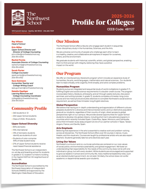 Northwest’s advisory program prepares you for success – today and in the years to come. In grades 9 and 10 you will meet weekly with your academic advisor to focus on academic skill development, goal setting, self-awareness, and more. These skills and ways of thinking will be essential for direct engagement with College Counseling.